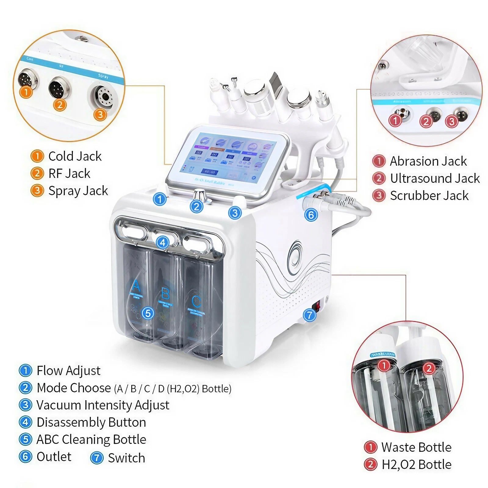 1- head:promote microcirculation,skin rejuvenating 2- Multipolar r: compact shaping, face lifting 3- Bio microcurrent: let jaw line tightened, Bio raise the overall tightening of facial skin 4- Hydrodermabrasion: facial cleansing, peeling, pore cleansing 5- cold hammer : cold down skin after treamtent 6- oxygen spray gun : skin rejuvenaiton