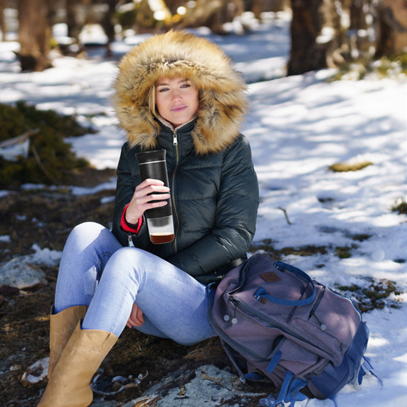 - 3-in-1 portable espresso machine with separate compartments for ground coffee and capsules.