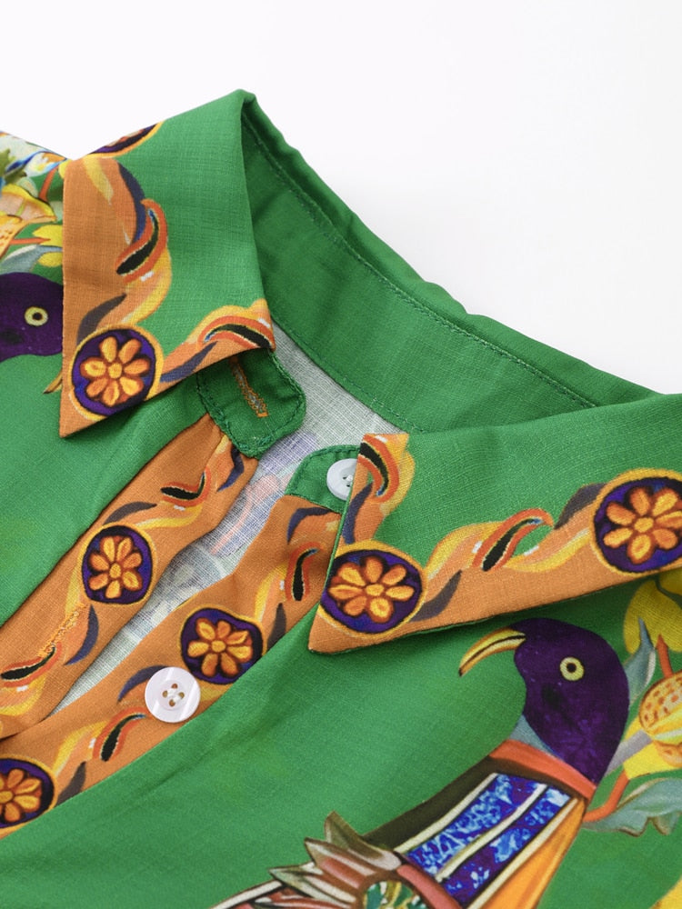 Birds Flower Printed Long Dress Women Belts Single Breasted Big Swing Holiday Long Lantern Sleeve Dresses Summer A-line Robe