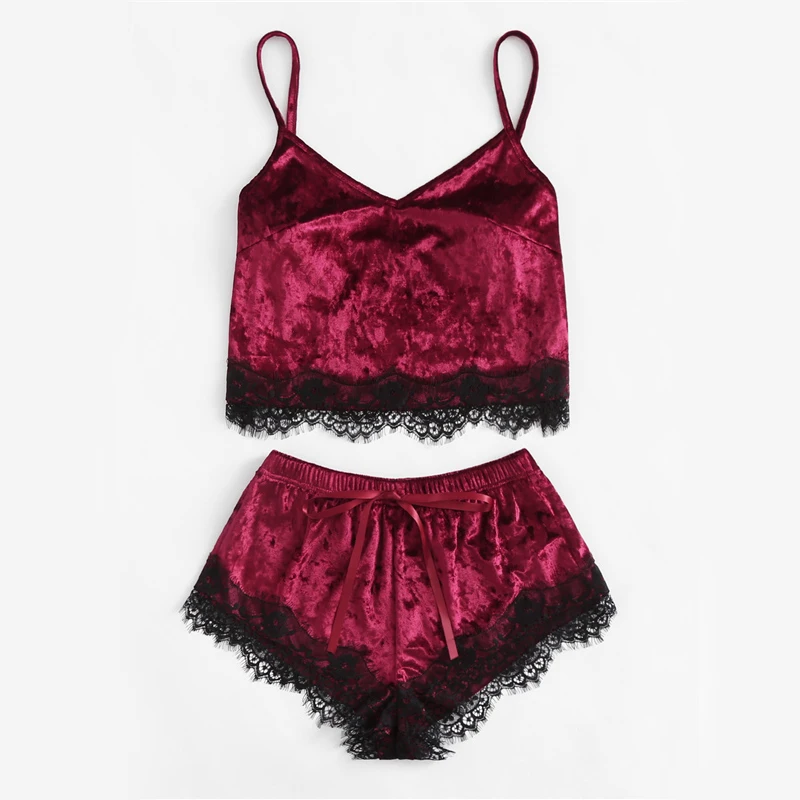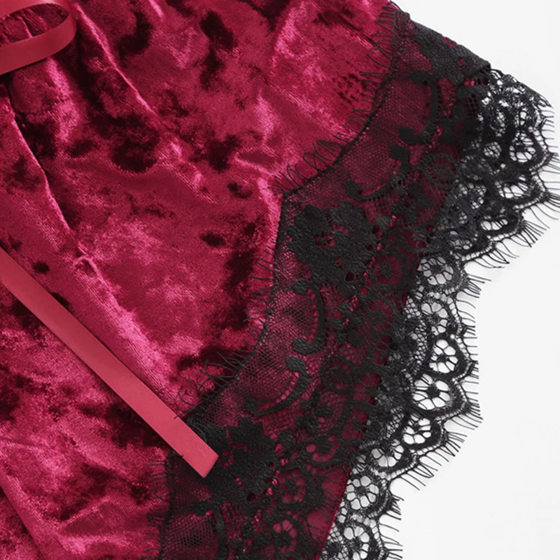 Burgundy Velvet 2 Piece Set Women Eyelash Lace Cami Top With Shorts Set Casual Sleeveless Vintage Two Piece Set
