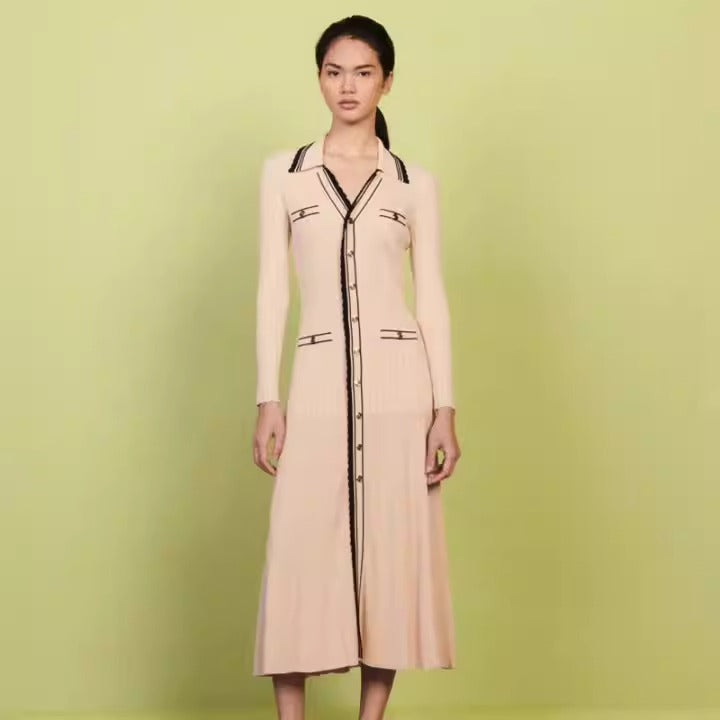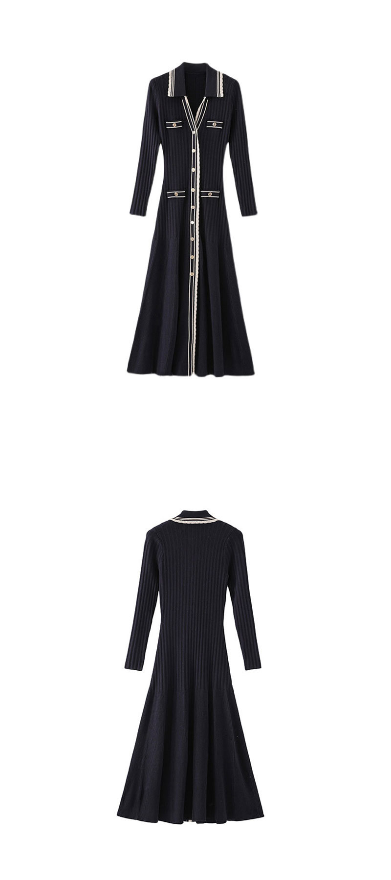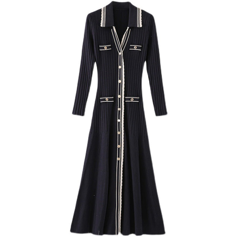 Long Dress French Contrast Stripe Small Fragrance Long Sleeve Knitted Dress Women's Autumn SFPRO02173