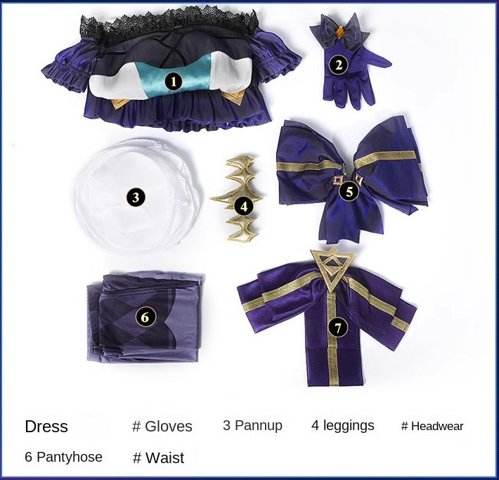 The clothing includes: one dress, one skirt support, one waist accessory, and one glove